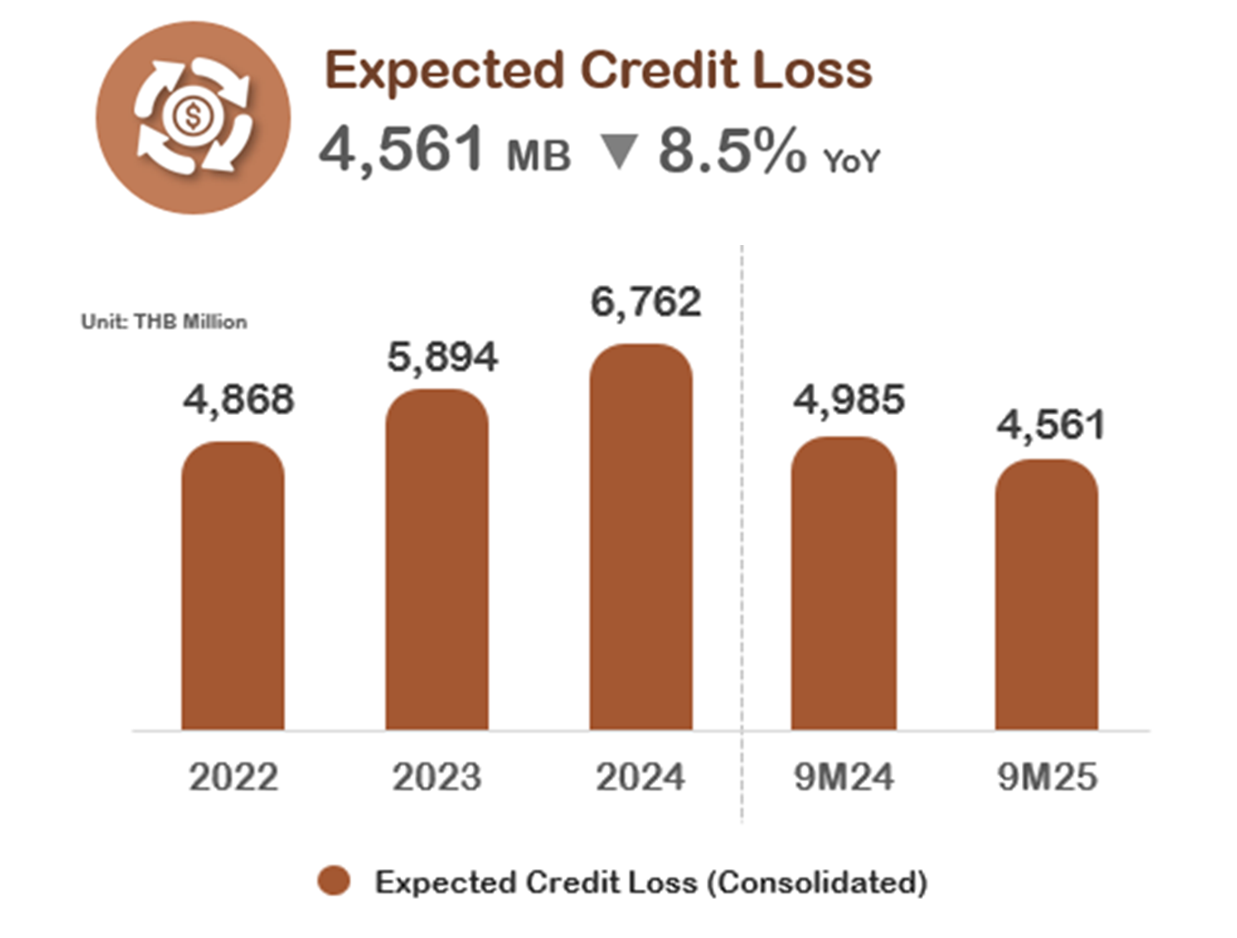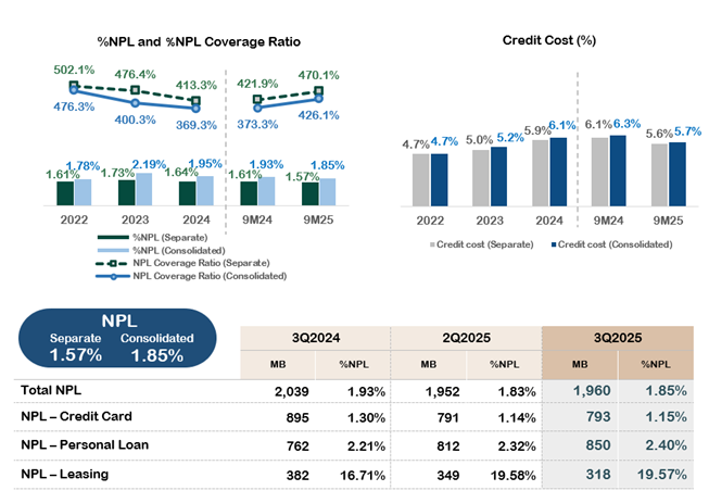 The credit cost for the Group stood at 5.4% for 3Q2025, down from 6.1% (YoY), and 5.7% for 9M2025, down from 6.3% (YoY). For the Separate Financial Statement, the credit cost decreased to 5.4% in 3Q2025 from 5.8% (YoY) and 5.6% in 9M2025 from 6.1% (YoY), reflecting effective management of overall asset quality in line with established targets.